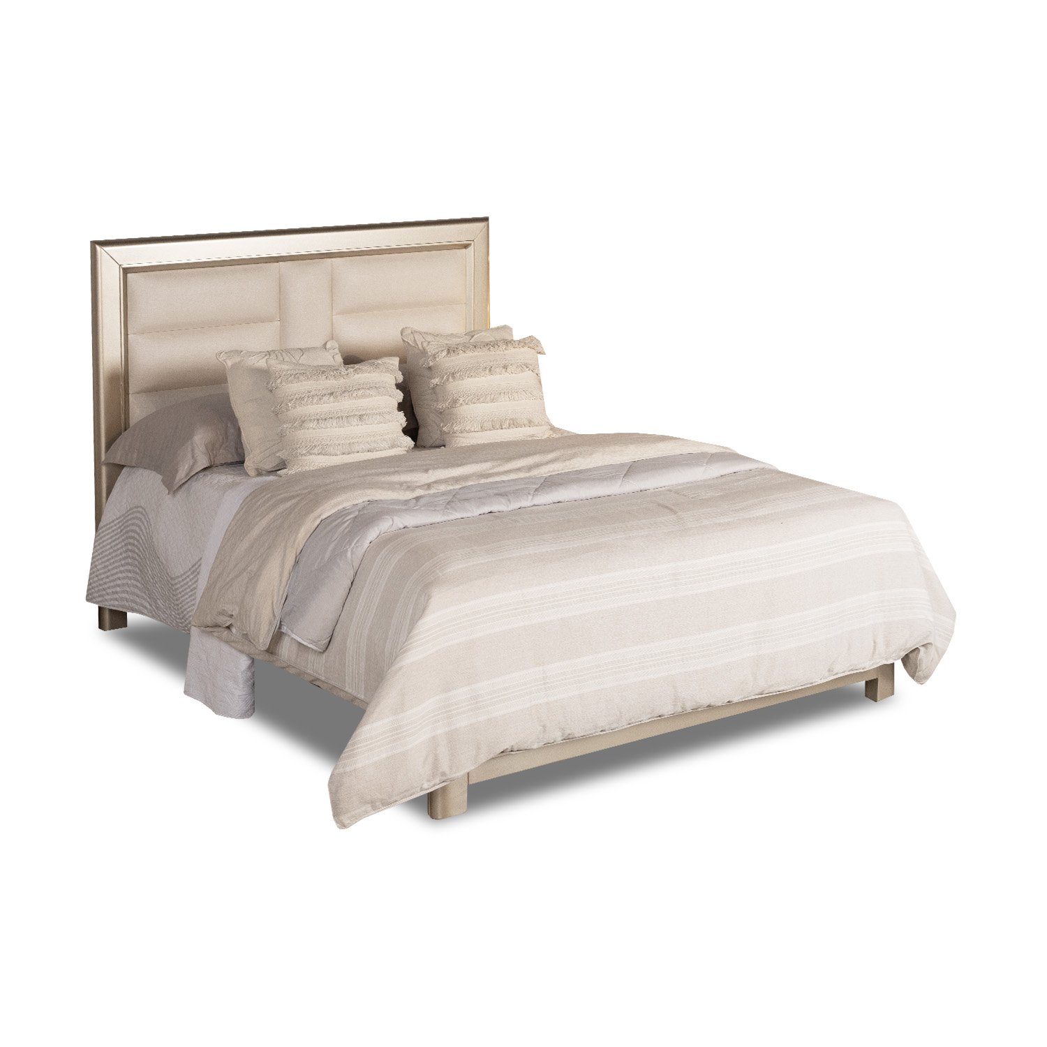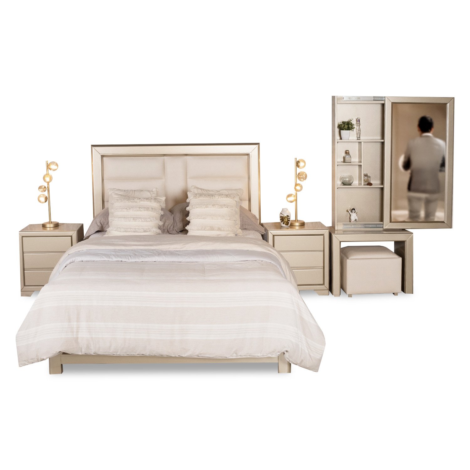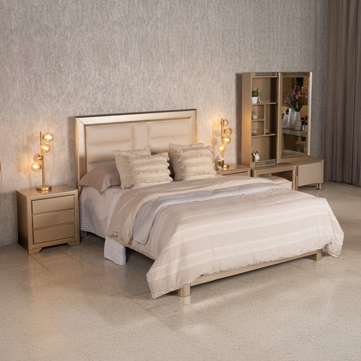 Estructura en Madera Roble, Tapizado en euro lino, nocheros contemporáneos y tocador con acabados champagne.