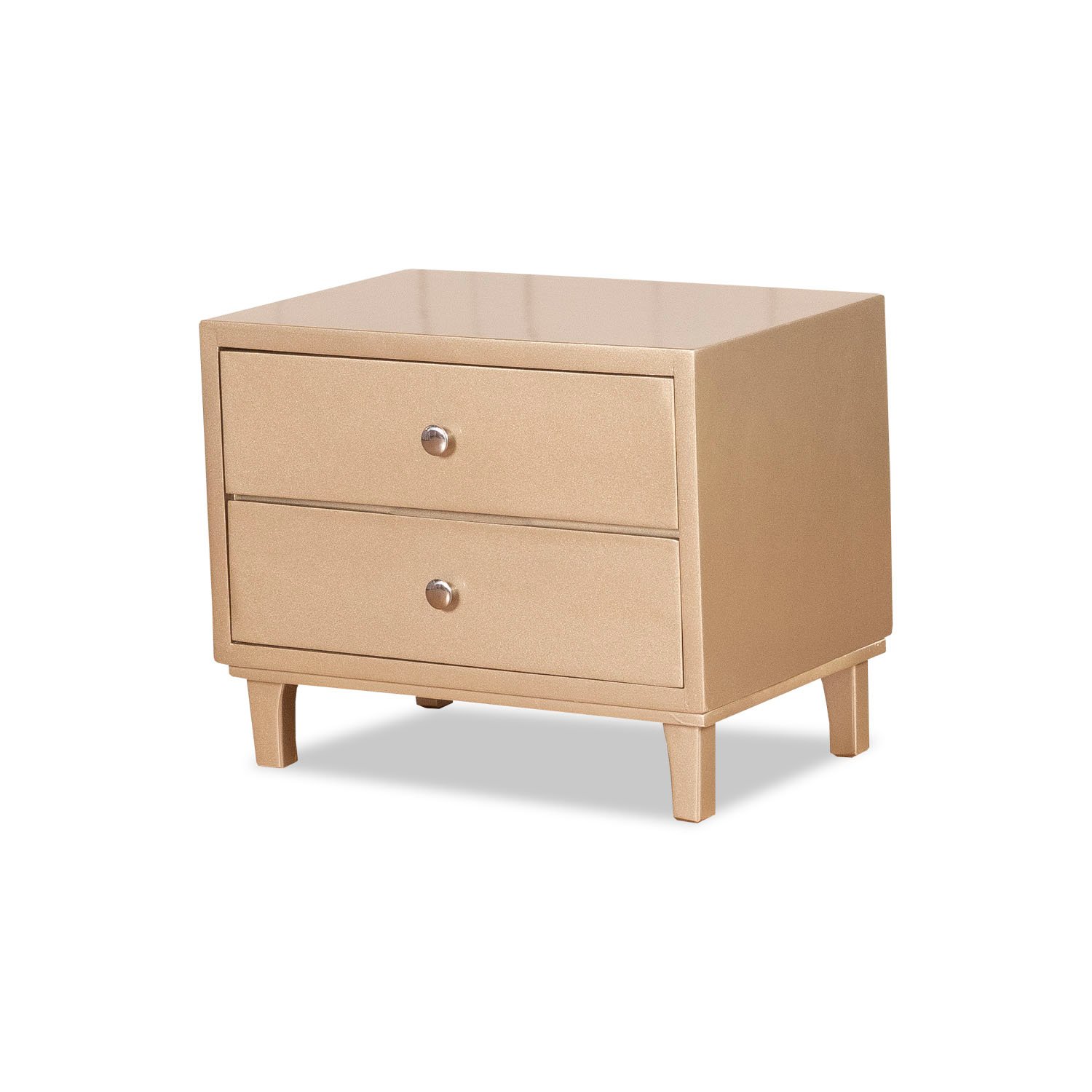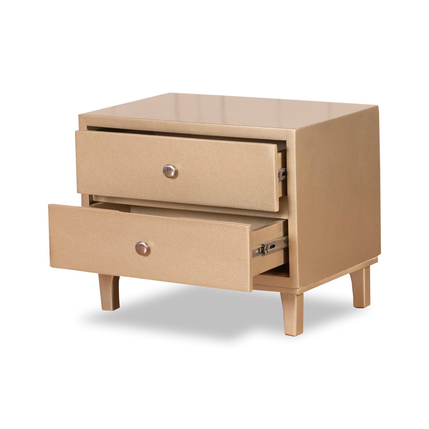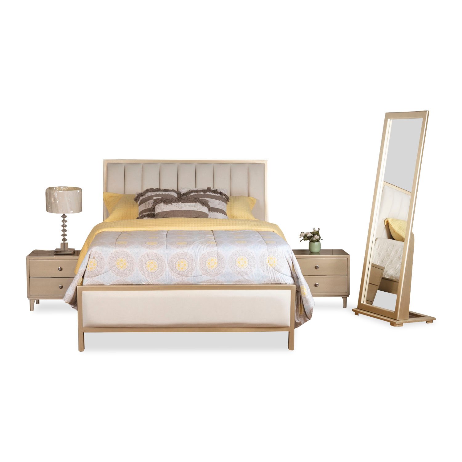 Estructura en Madera Roble, Tapizado, nocheros contemporáneos y tocador con acabados champagne.