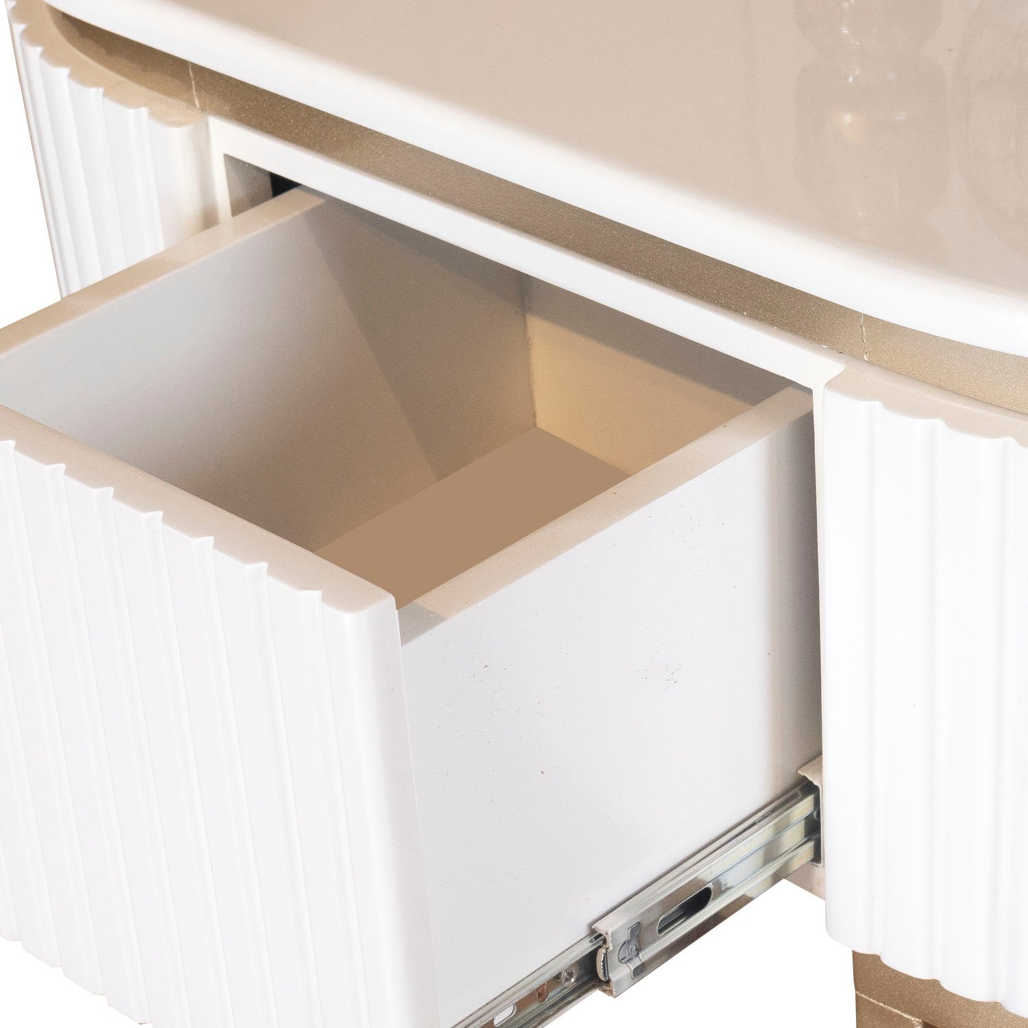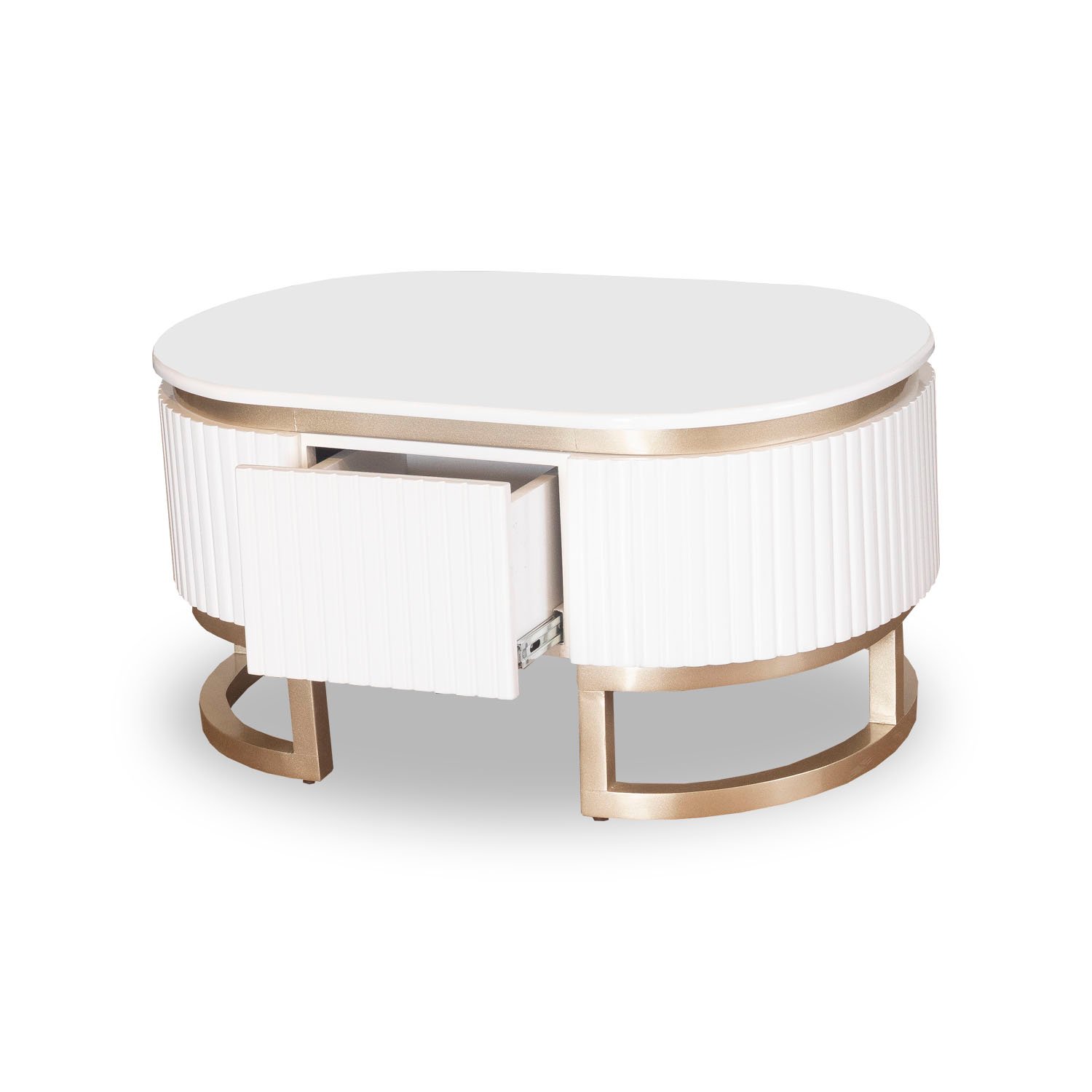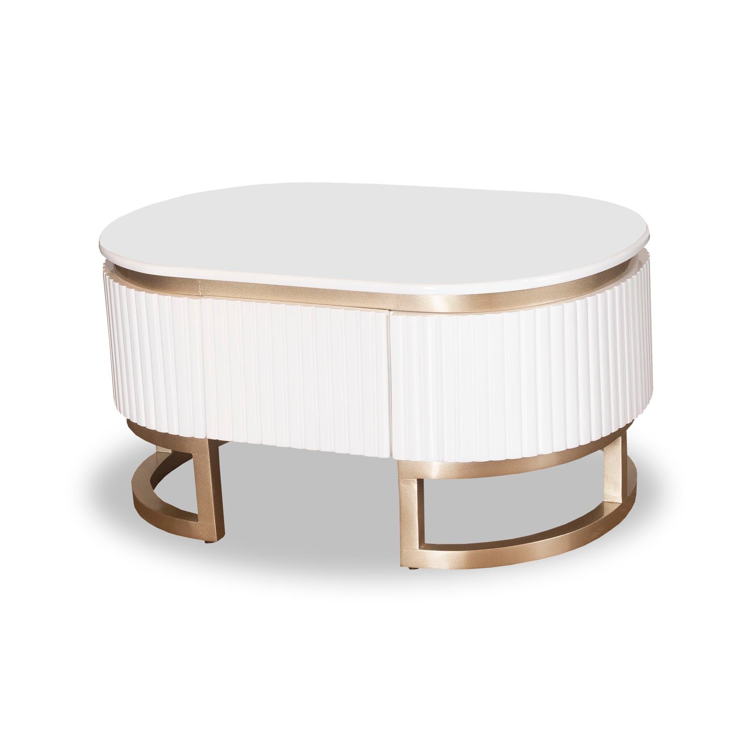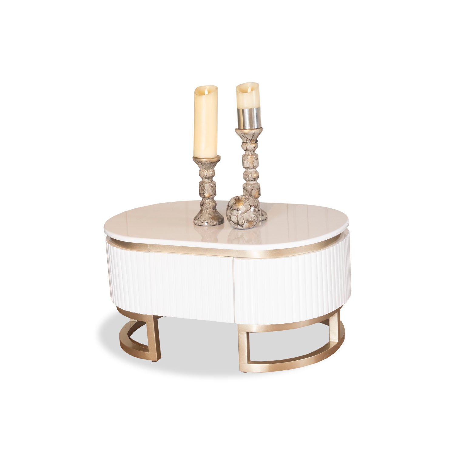 Mesa de centro de forma ovalada en tonos blanco perla y champagne con acabados elegantes y de alta resistencia.