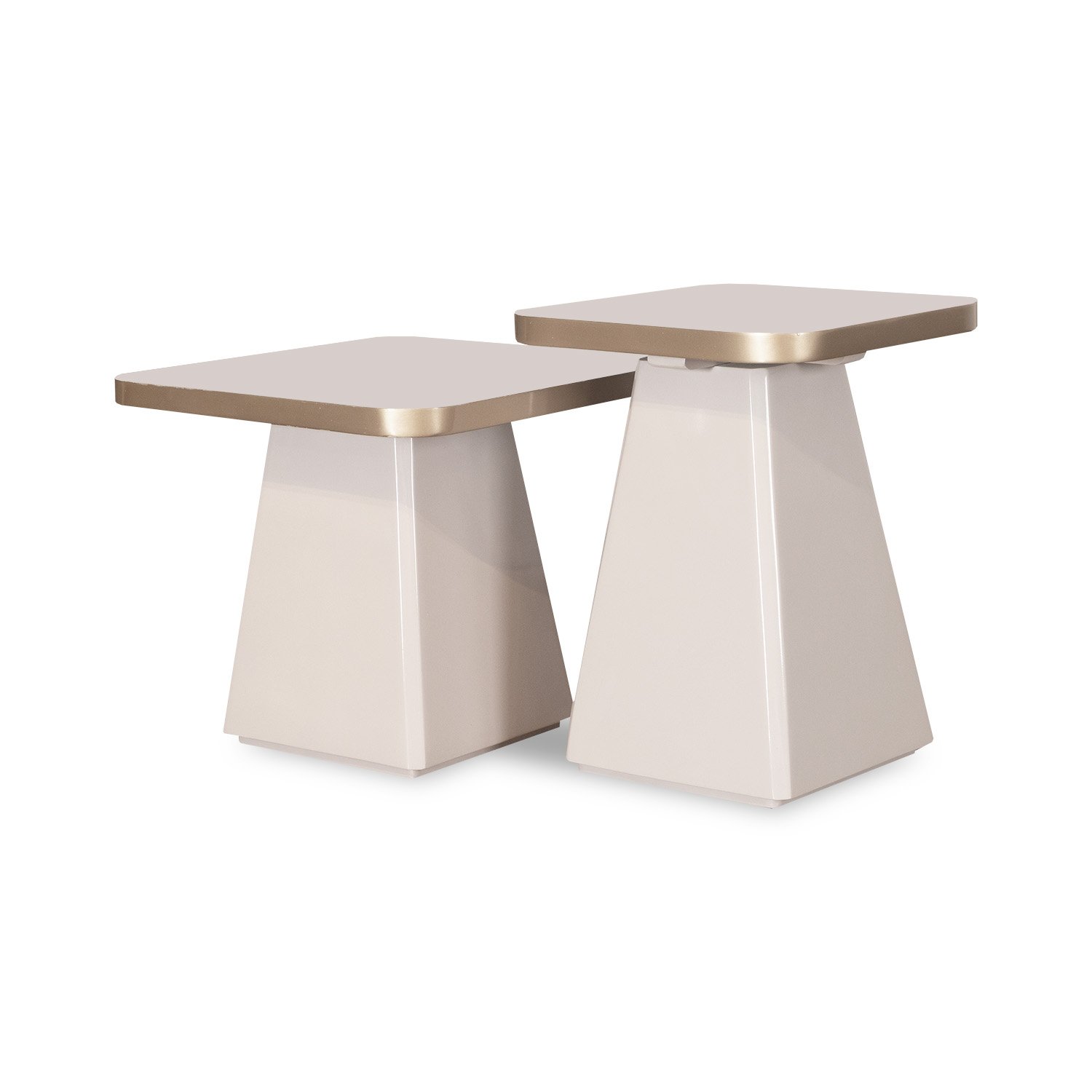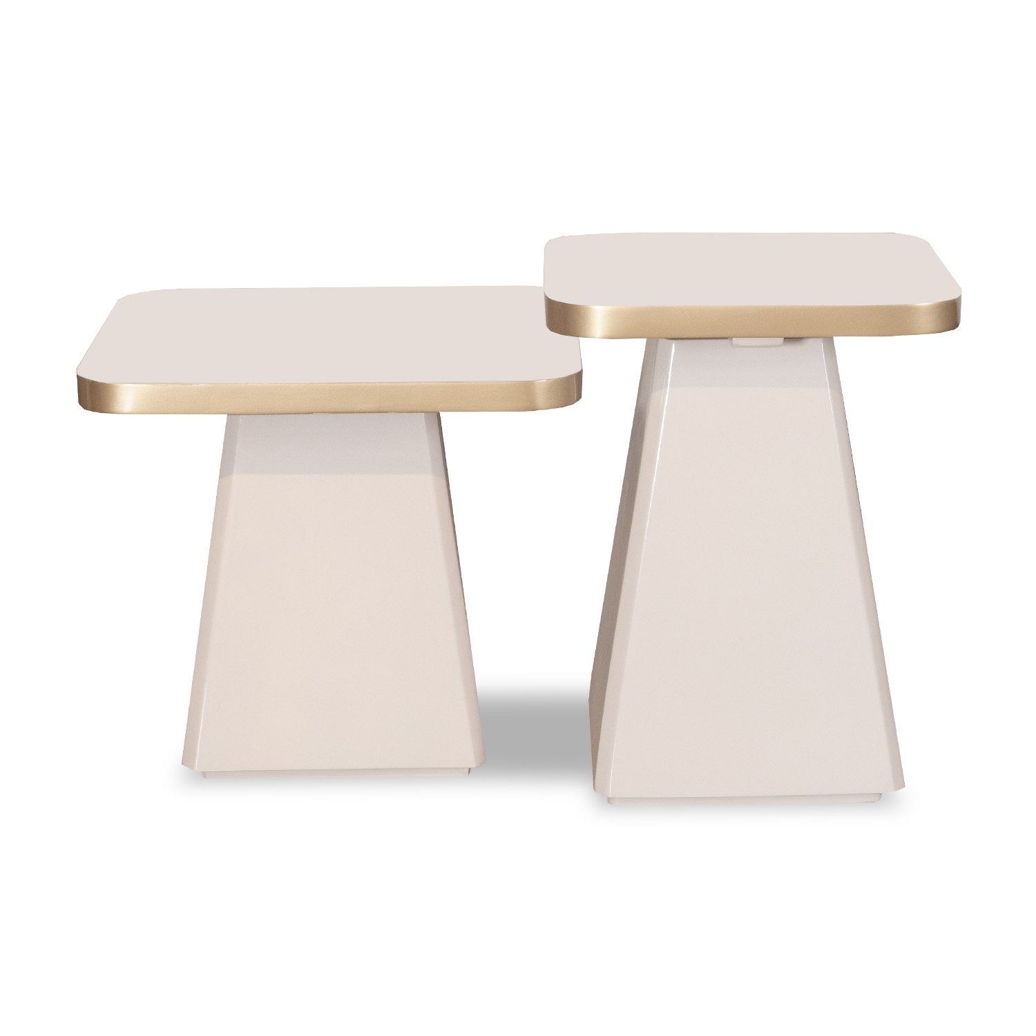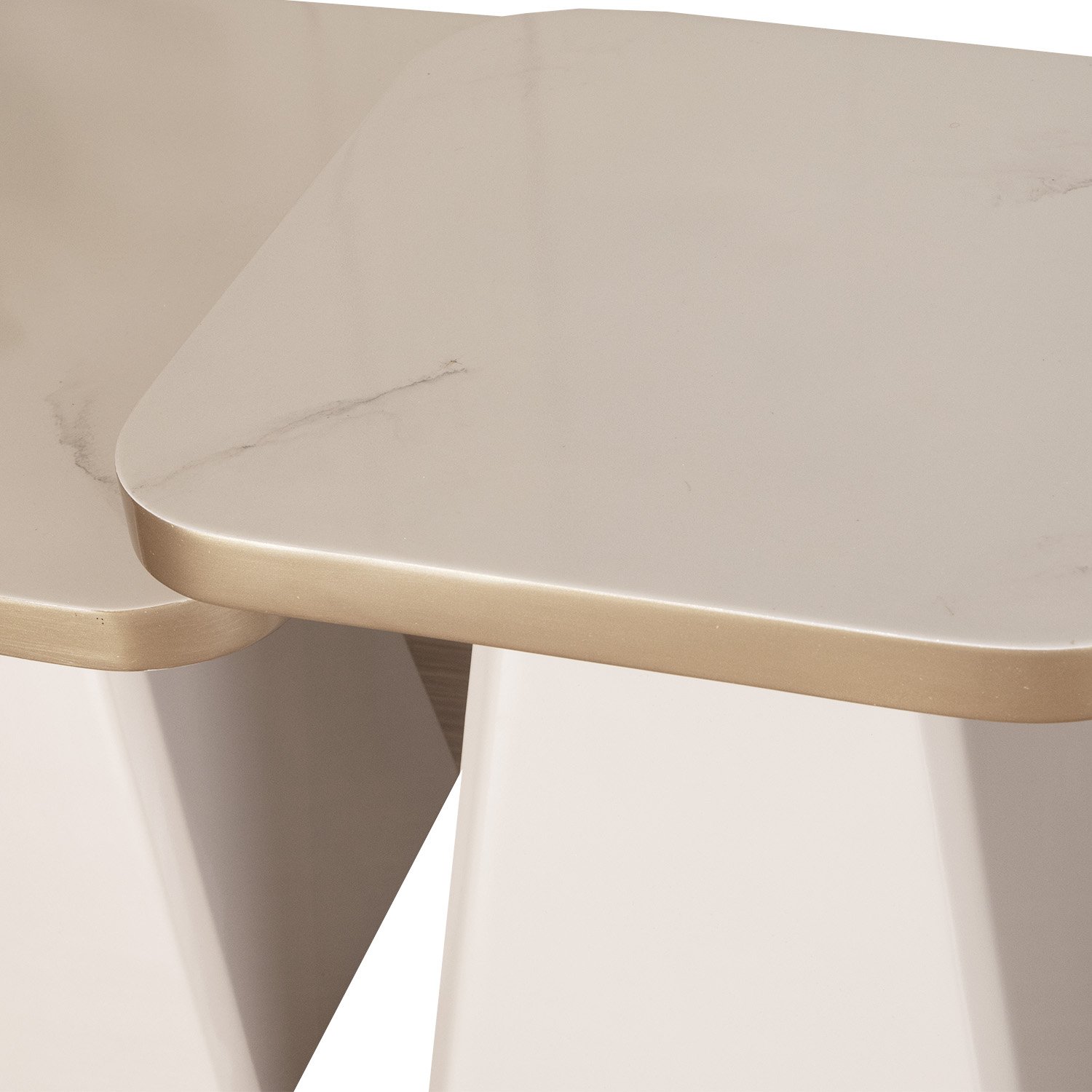 Mesa de centro en tono off white y champagne con acabados elegantes y de alta resistencia. Cubierta con efecto mármol.