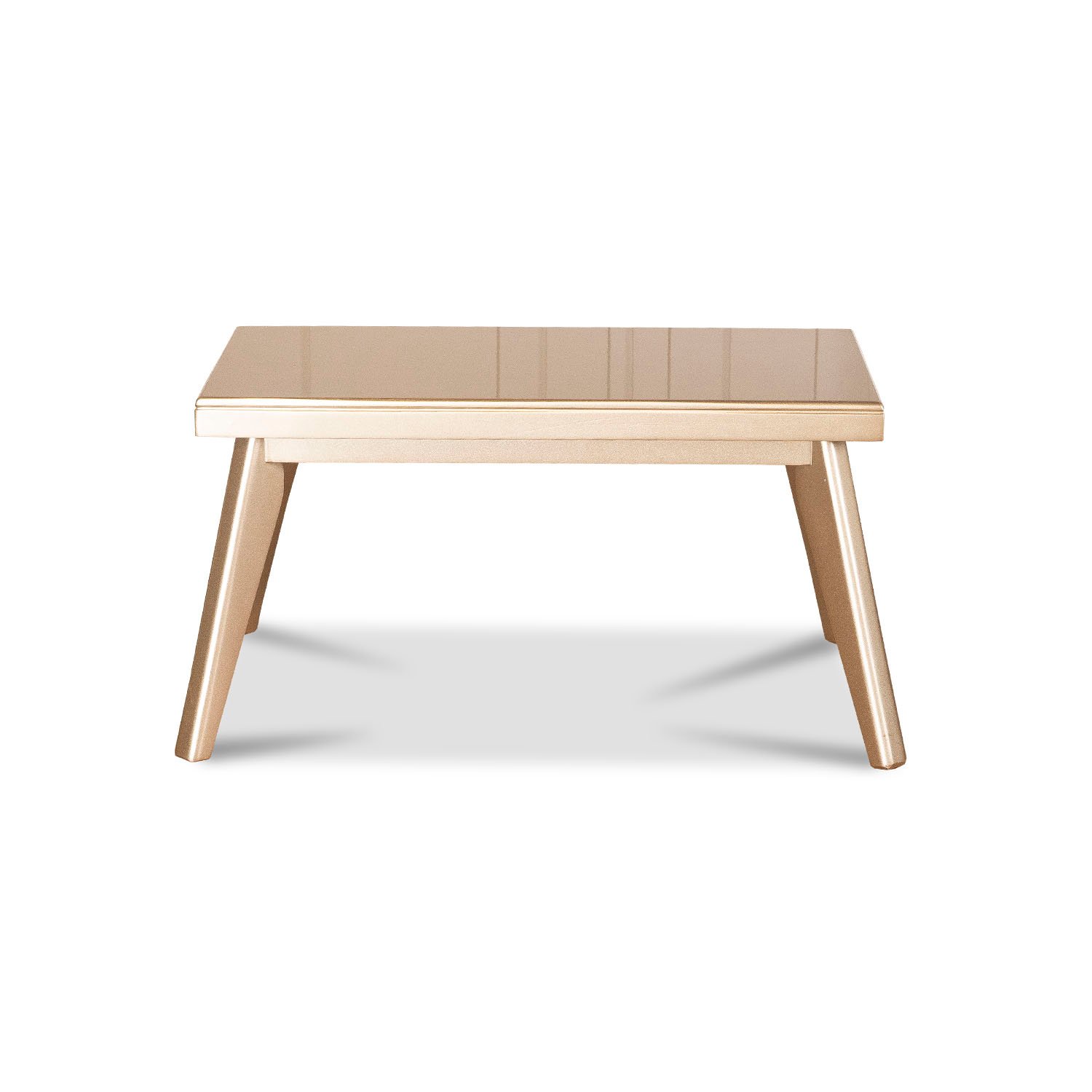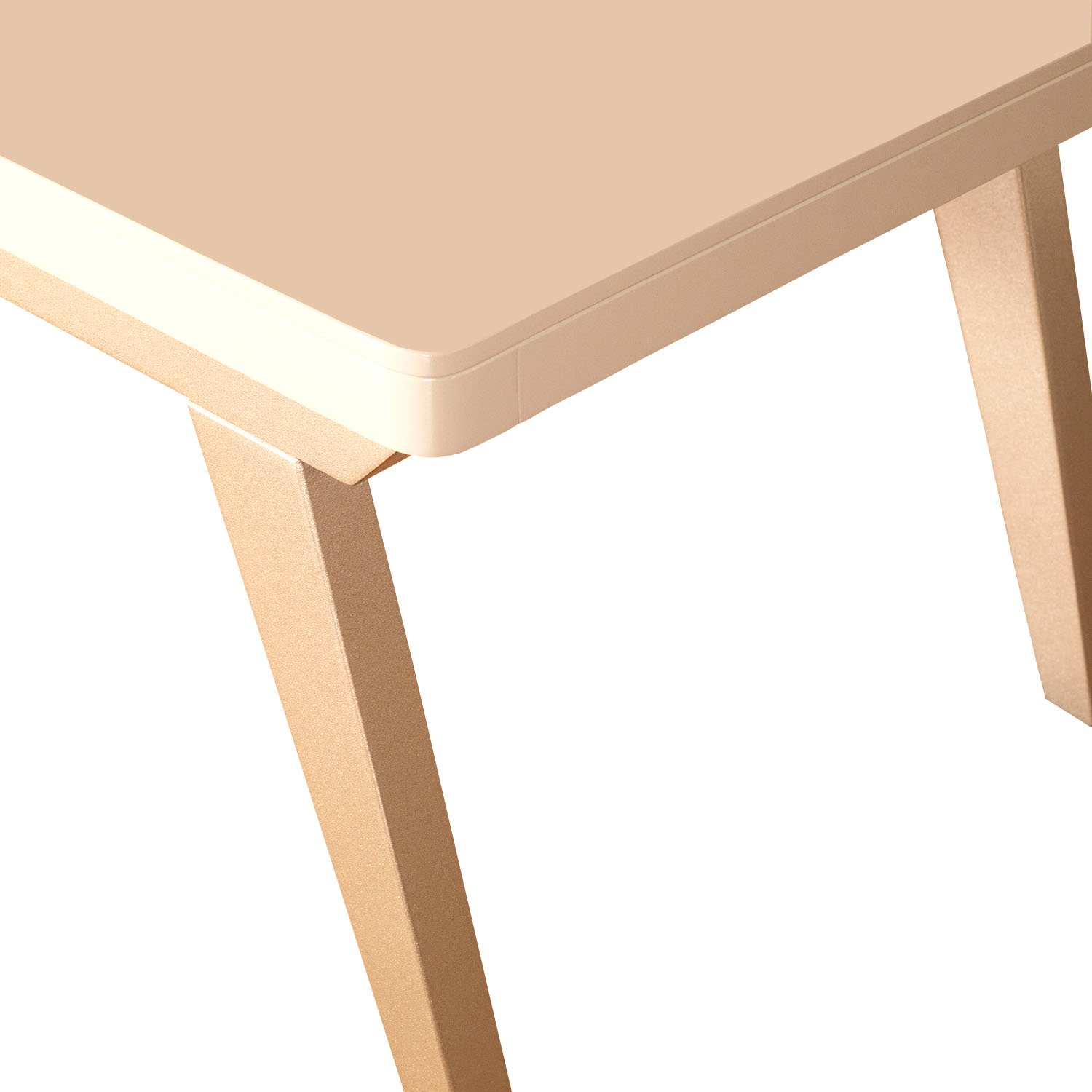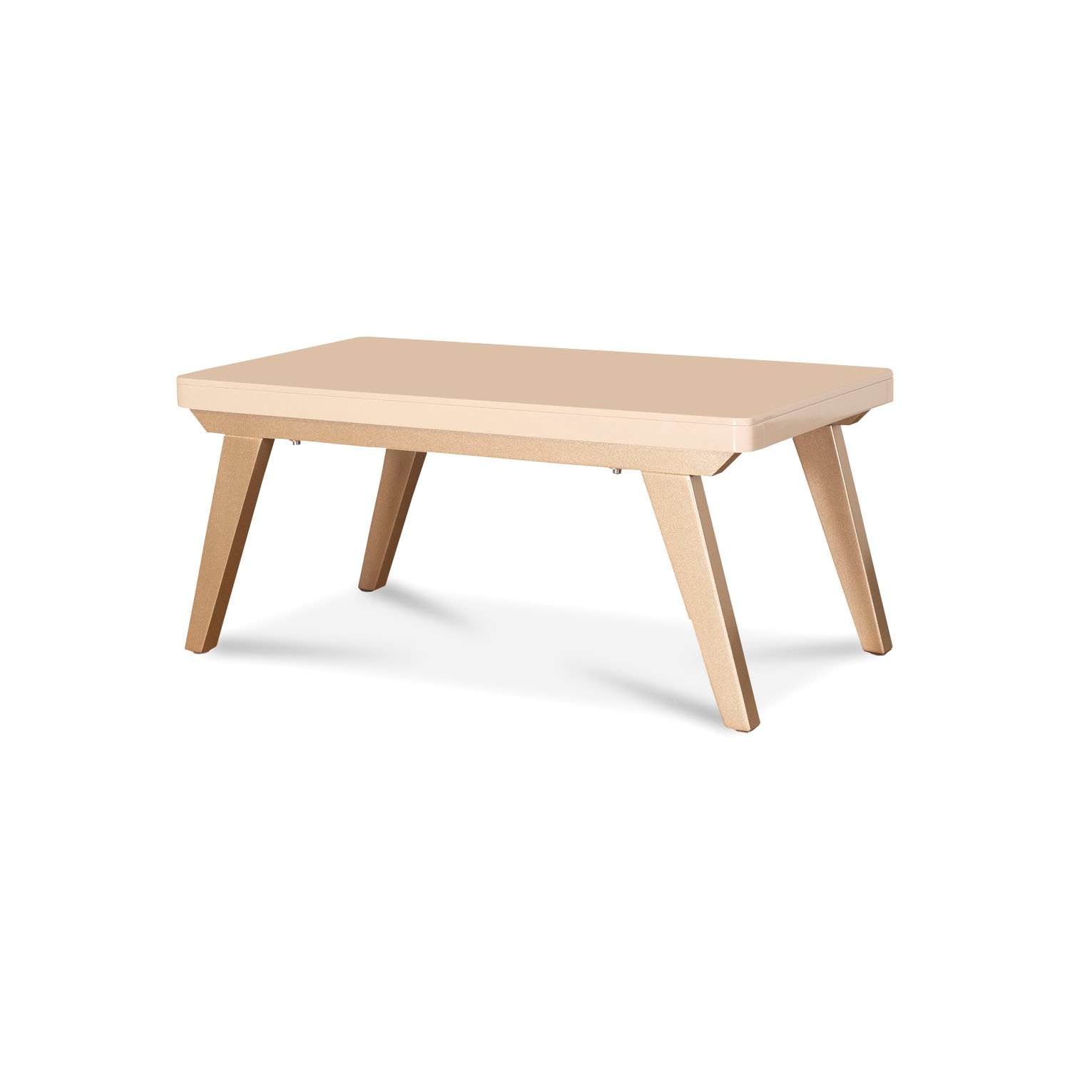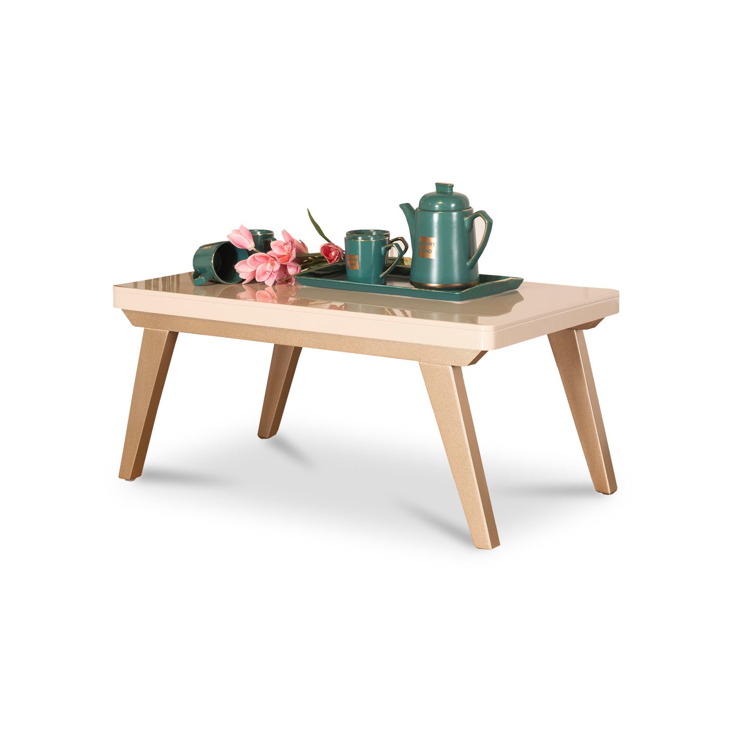 Mesa de centro en tono champagne y cubierta blanco perla con acabados de alta resistencia.
