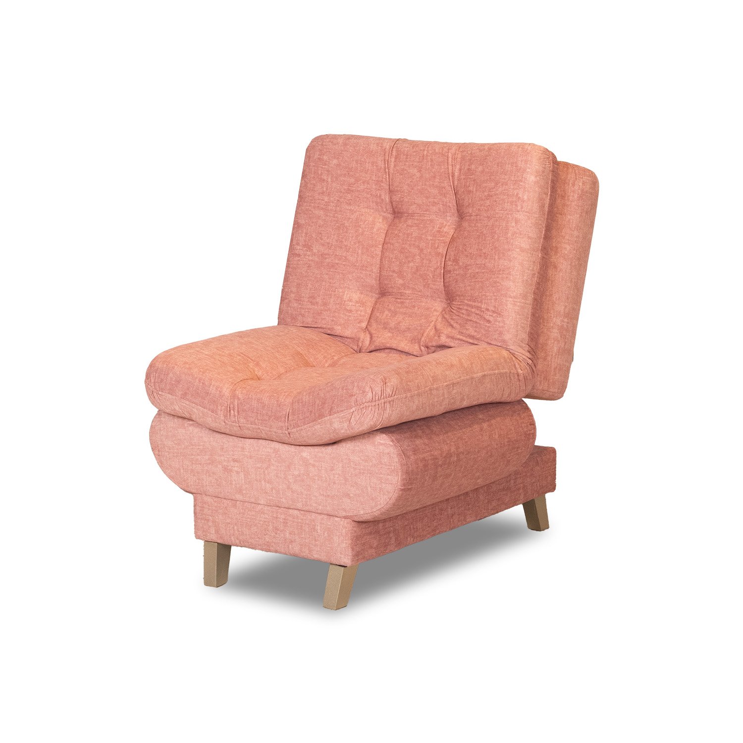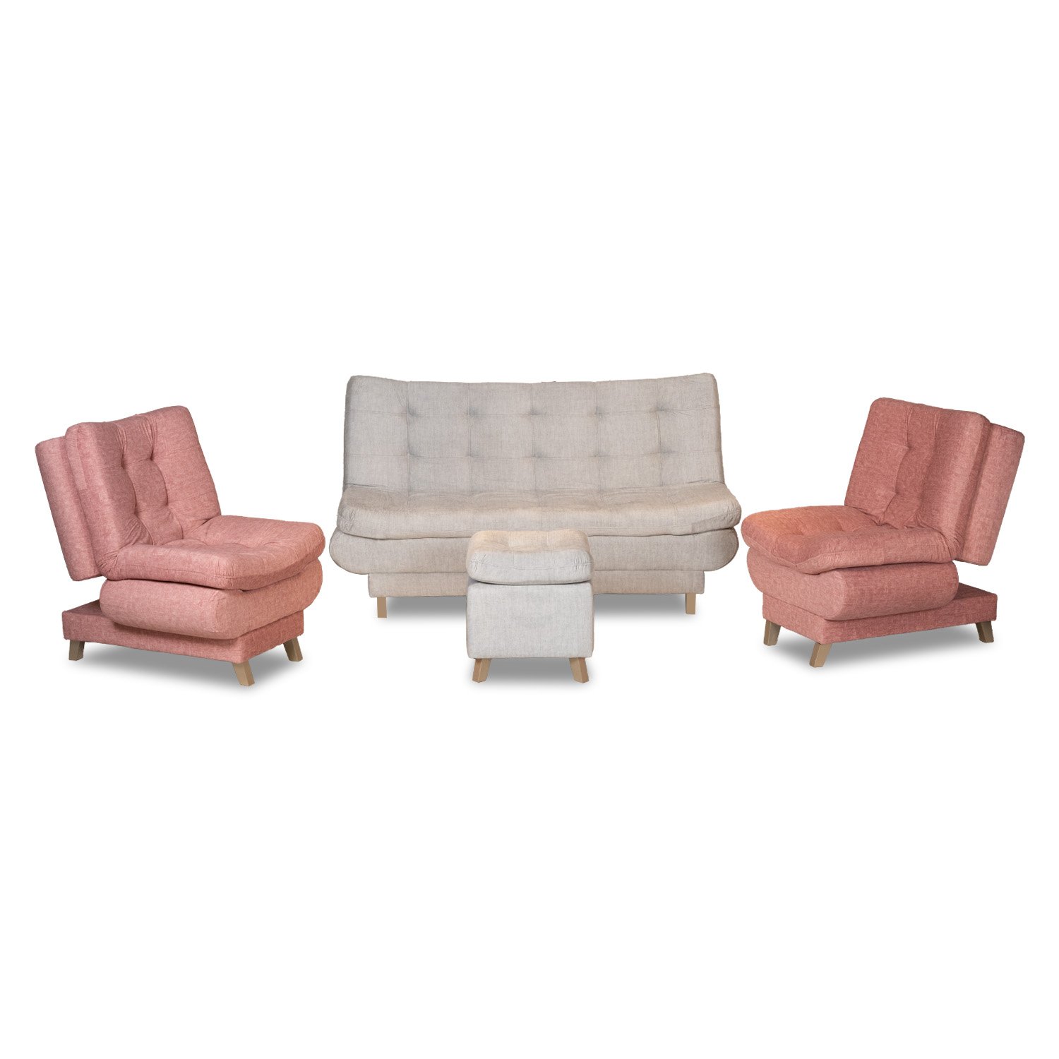 Juego de sala multifuncional. El sofá y sus dos butacas tienen un sistema “click clack” reclinable el cual los permite transformar la sala completamente. Fabricada con madera seca e inmunizada en Roble y tapizada en tela de fácil limpieza. Incluye: Sofá, dos butacas y puff.